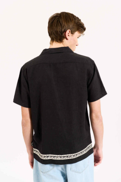 La camisa Vacay Nomad Ss de manga corta con cuello solapa y guarda estampada en el ruedo que le da un toque diferencial. Su tejido liviano de ramín y tencel ofrece caída fluida y confort.