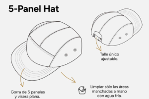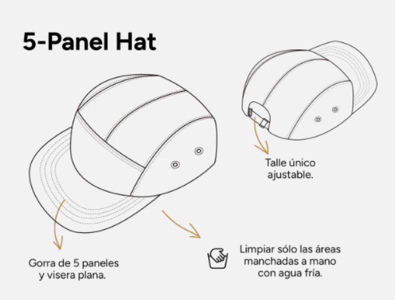 Gorra de 5 paneles hecha con poliéster y corderoy color azul. Ajustable, de visera plana y sin estructura. Altura de corona baja.