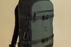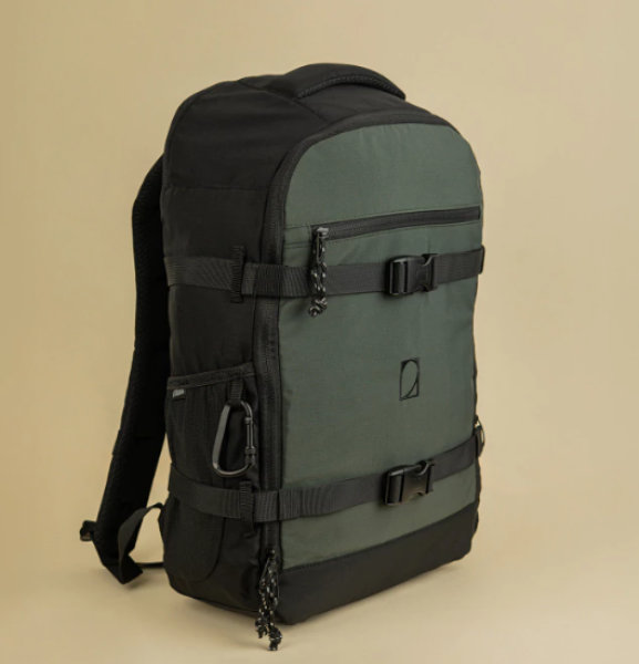 Mochila con capacidad de 28 litros color verde y negro. El cuerpo es de oxford y ripstop repelentes al agua, y la base está reforzada con poliéster PVC. Las tiras y la base están acolchadas con foam para mejor soporte. El bolsillo principal tiene apertura total con acceso tipo valija.