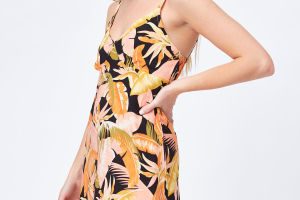 Nuestro Wave Tribe es un vestido de fibrana estampada corto y suelto, con breteles regulables y elástico bajo busto.